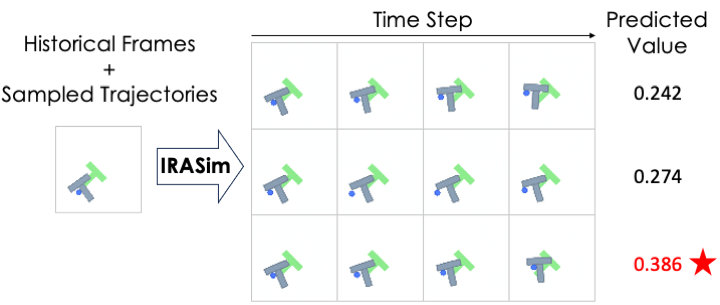 We conduct experiments on the Push-T benchmark to demonstrate that IRASim can serve as a world model for model-based planning, enhancing the performance of vanilla manipulation policies. Specifically, we adapt a simple ranking algorithm for planning: (1) sample K trajectories from the policy, (2) simulate each trajectory using IRASim, and (3) select the one with the highest predicted value for execution.